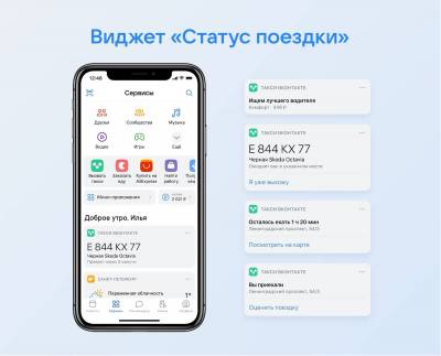 Теперь вся информация о заказе в Такси Вконтакте доступна в виджете «Статус поездки». Функция находится на вкладке «Сервисы».
